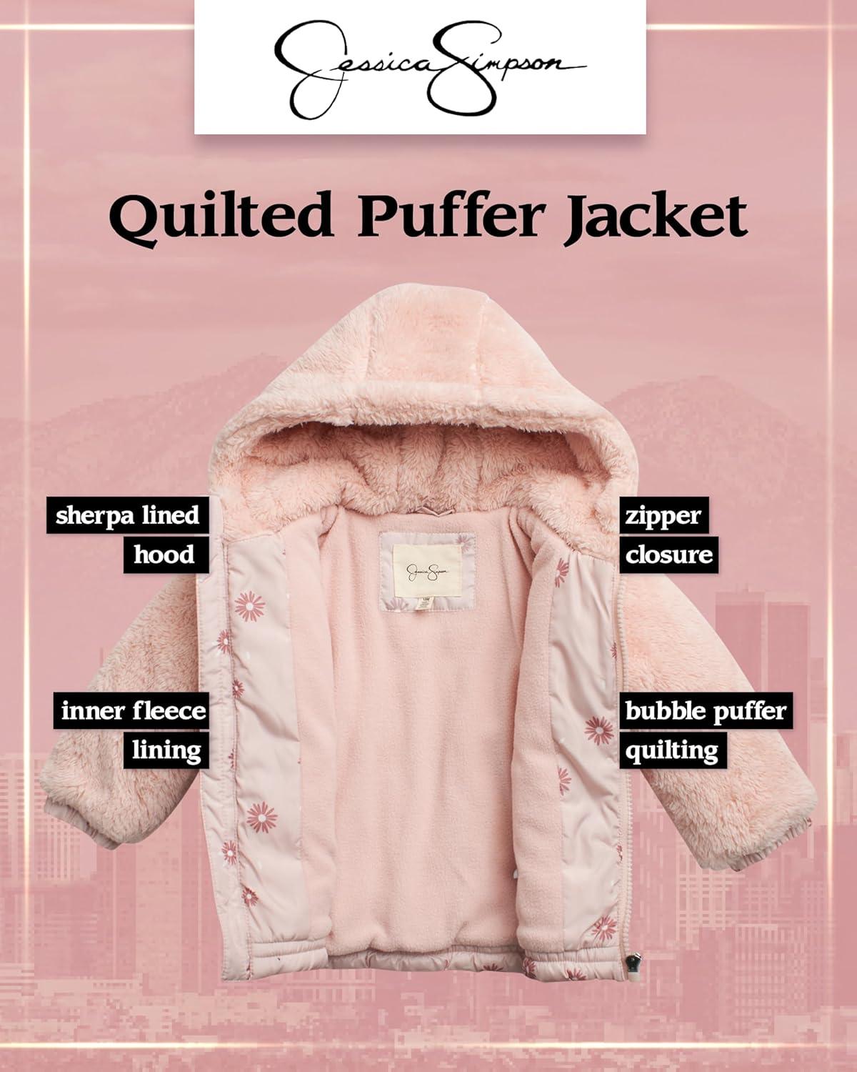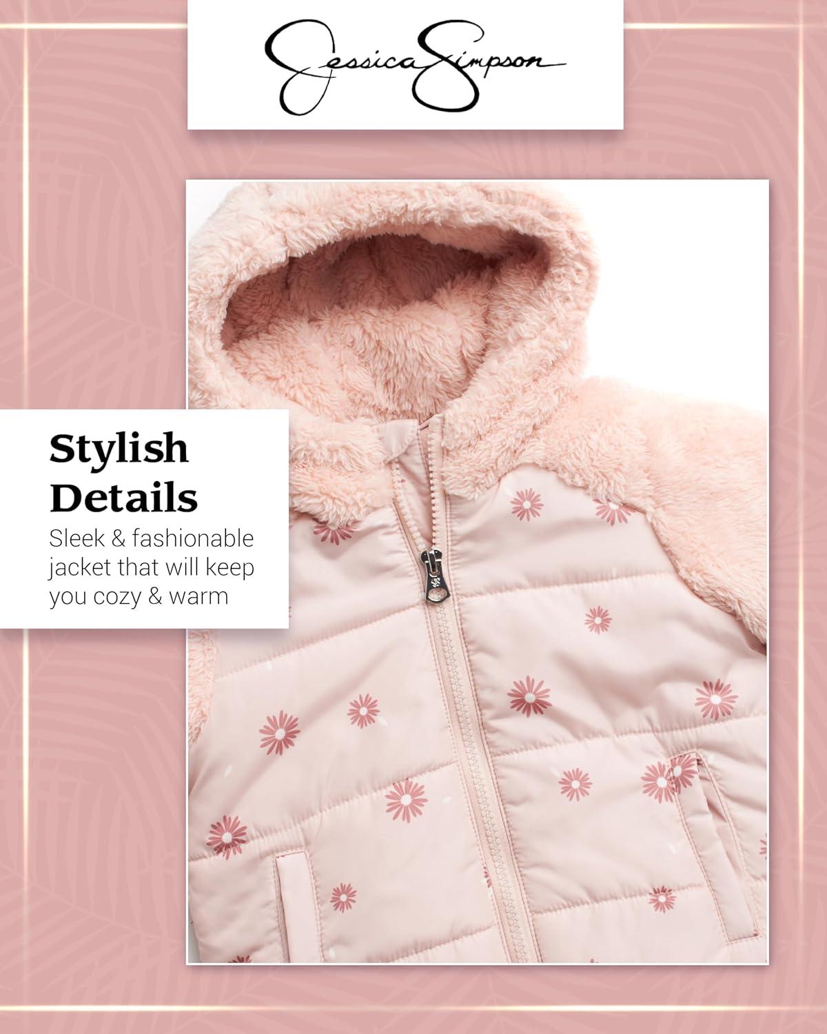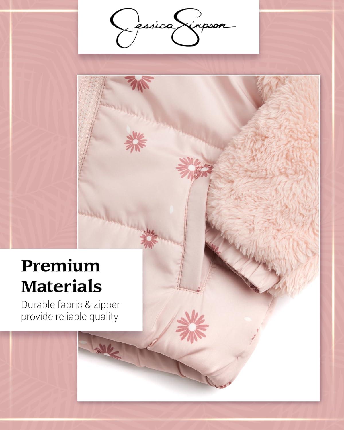 Jessica Simpson Baby Infant Girls Puffer Jacket – Quilted Sherpa Lined Hood Heated Winter Jackets for Toddler Girls (12M-24M)(Light Pink Print)