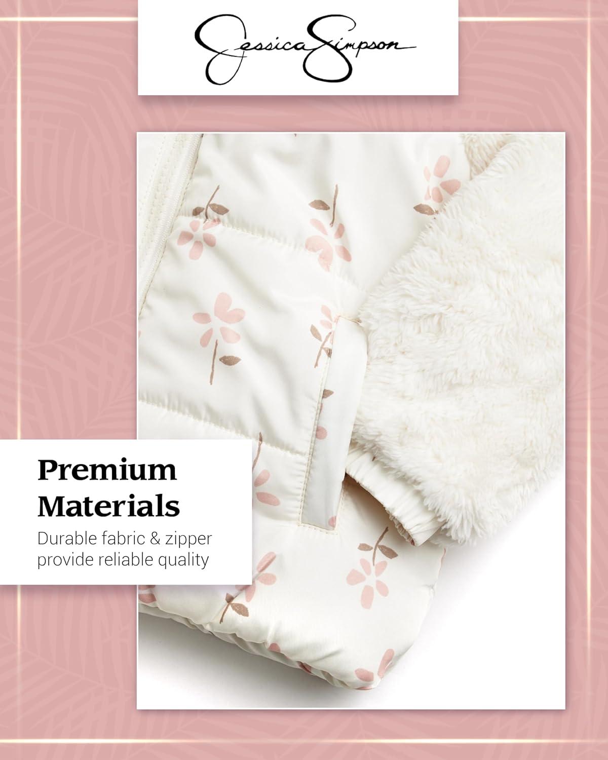 Jessica Simpson Baby Infant Girls Puffer Jacket – Quilted Sherpa Lined Hood Heated Winter Jackets for Toddler Girls (12M-24M)(White Pink Floral)