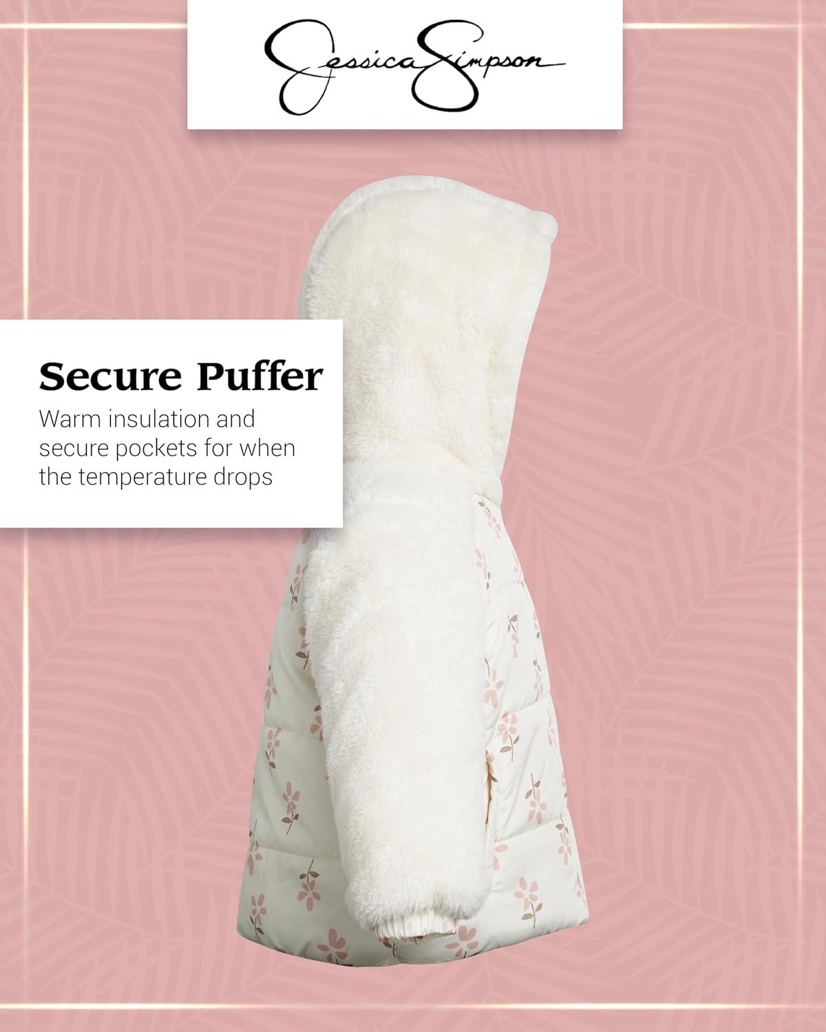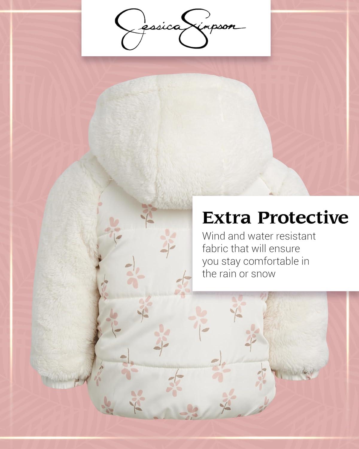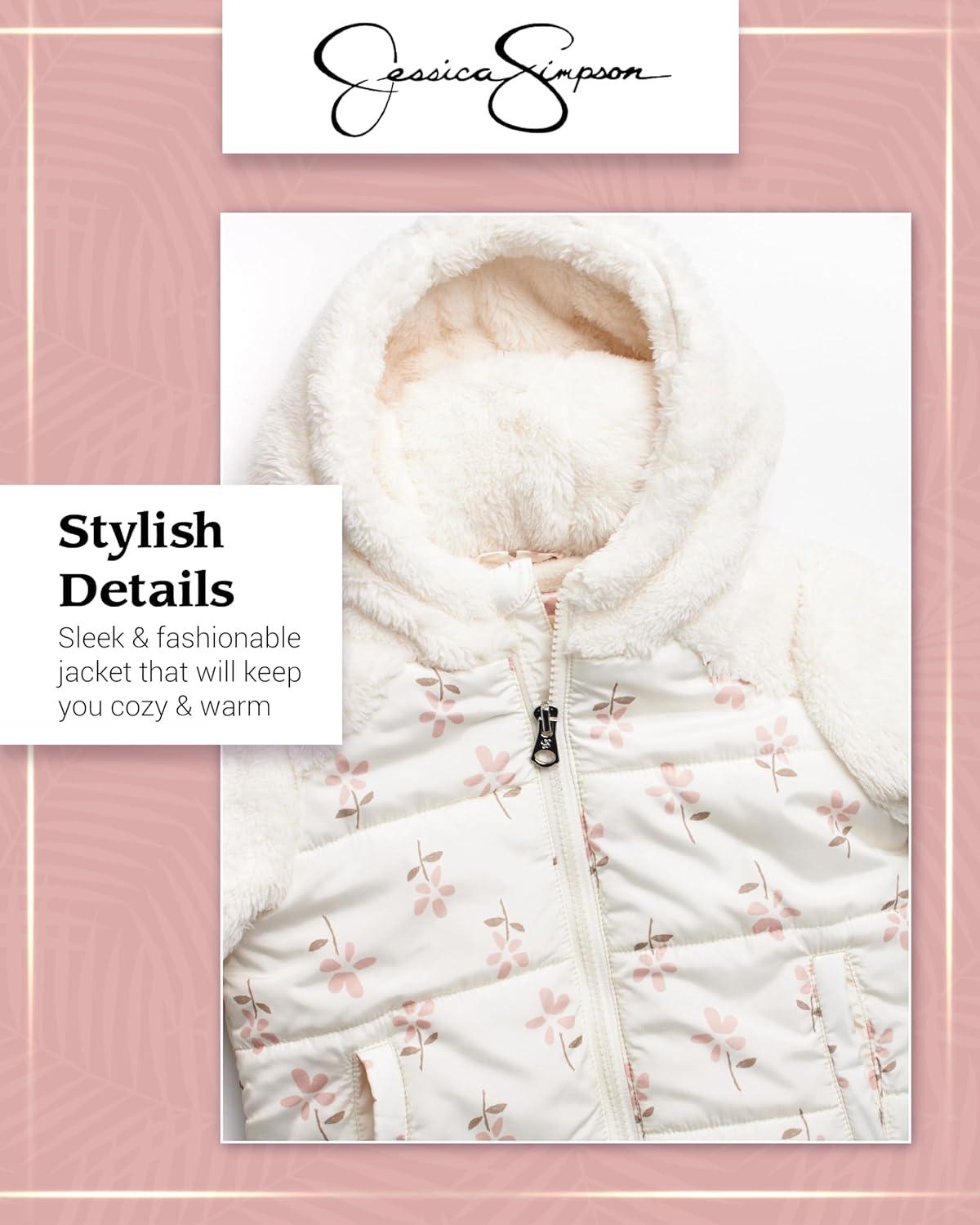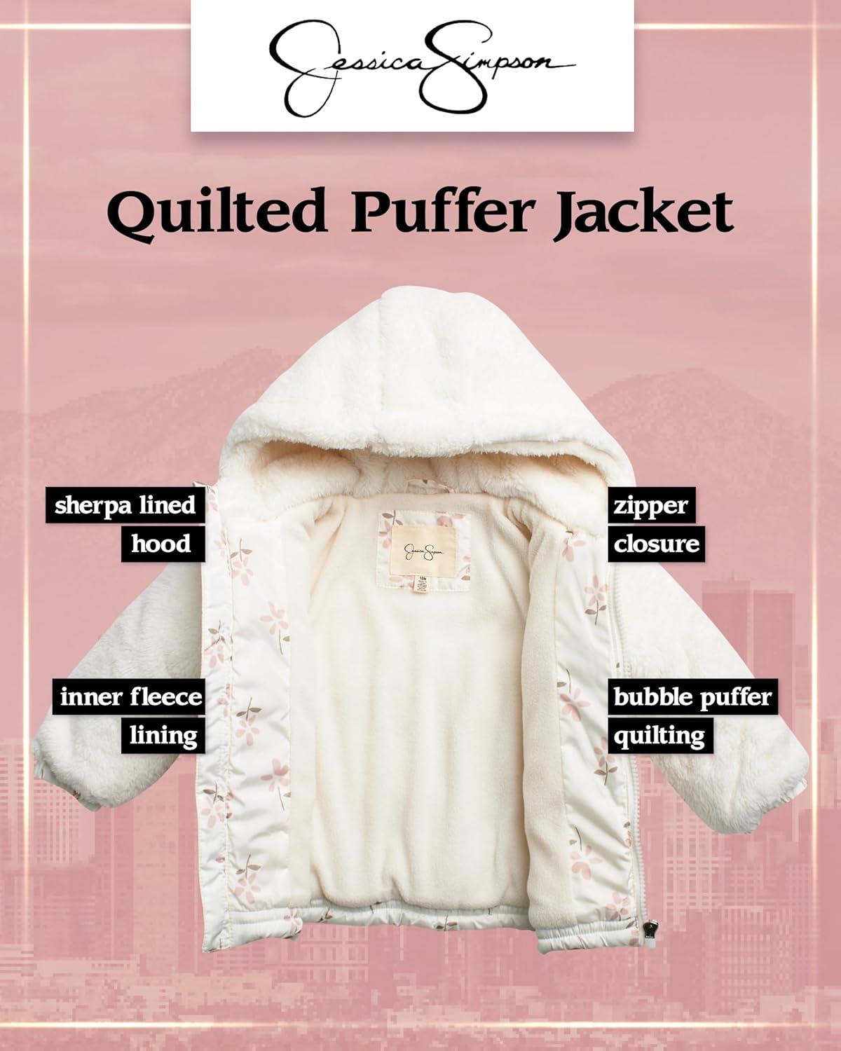 Jessica Simpson Baby Infant Girls Puffer Jacket – Quilted Sherpa Lined Hood Heated Winter Jackets for Toddler Girls (12M-24M)(White Floral)