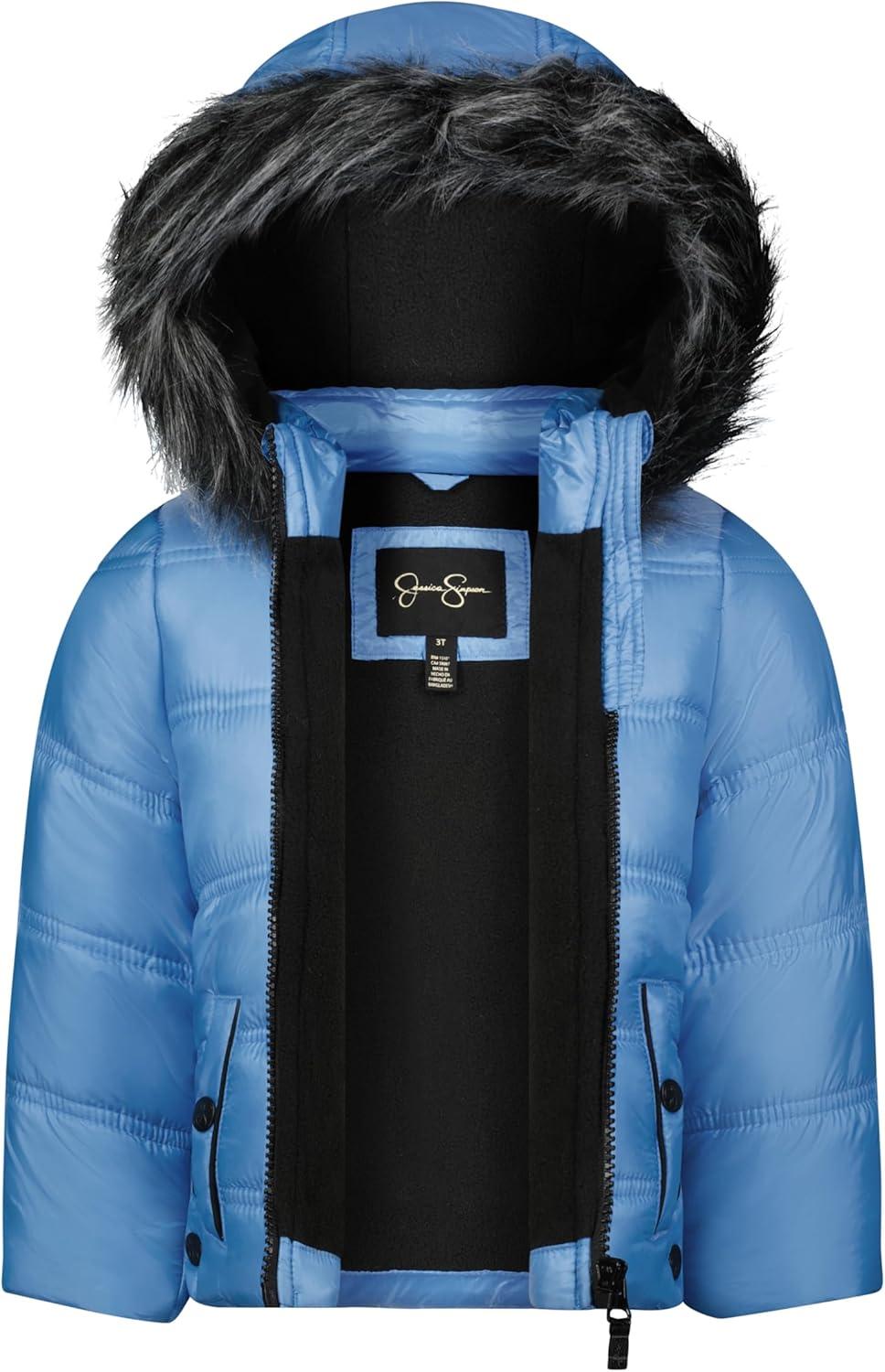 Get them ready for winter adventures with this stylish and functional Jessica Simpson snowsuit set. The set includes a cozy puffer jacket featuring a soft faux fur-trimmed hood and matching snow bib overalls. Both pieces are designed with water-resistant fabric to help keep her dry during snowy or rainy days. The puffer jacket has a warm fleece lining and a full-zip front for easy layering, while the snow bib overalls feature adjustable straps and a zip-up front for a snug fit. Perfect for outdoor play, skiing, or snowboarding, this set offers both warmth and protection from the elements.