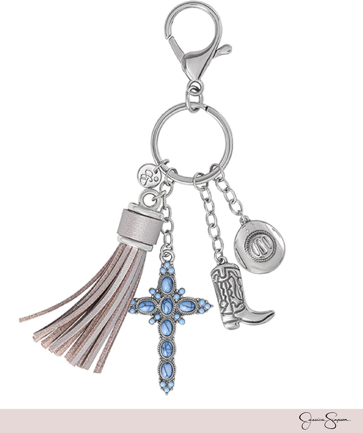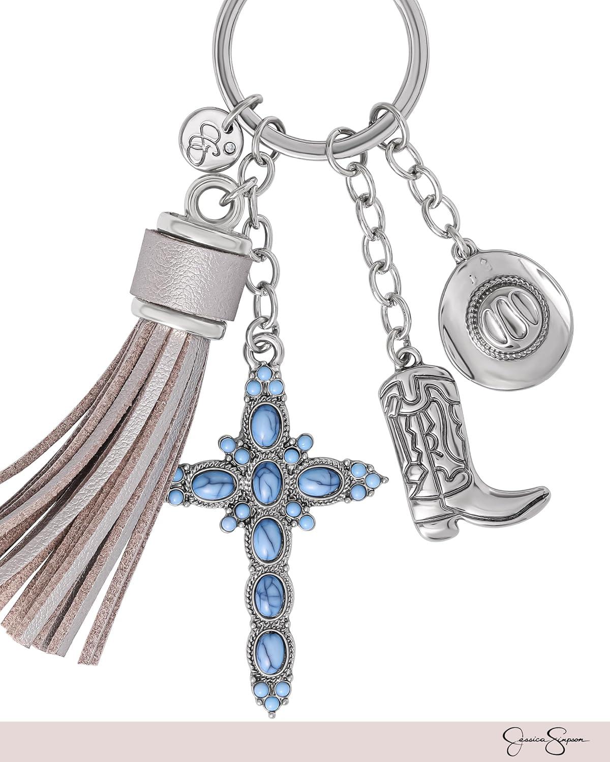 Jessica Simpson Pave Crystal Keychain for Women, Cute Purse Charms and Bag Charms for Handbag, Tote Bag, Backpack(Turquoise Cross)