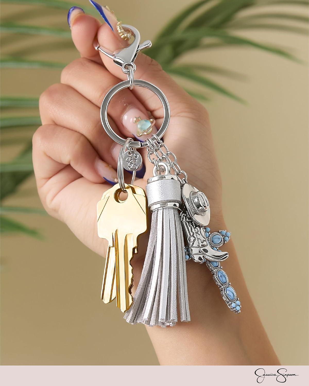 Add a touch of sparkle to your everyday essentials with Jessica Simpson keychain and purse accessories. These aesthetic keychains are perfect for giving your keys, bag, or purse a stylish makeover. Featuring a combination of logo and novelty charms adorned with clear pavé crystals—including designs like a butterfly, cross, primary key, and heart—each keyring adds personality and shine.