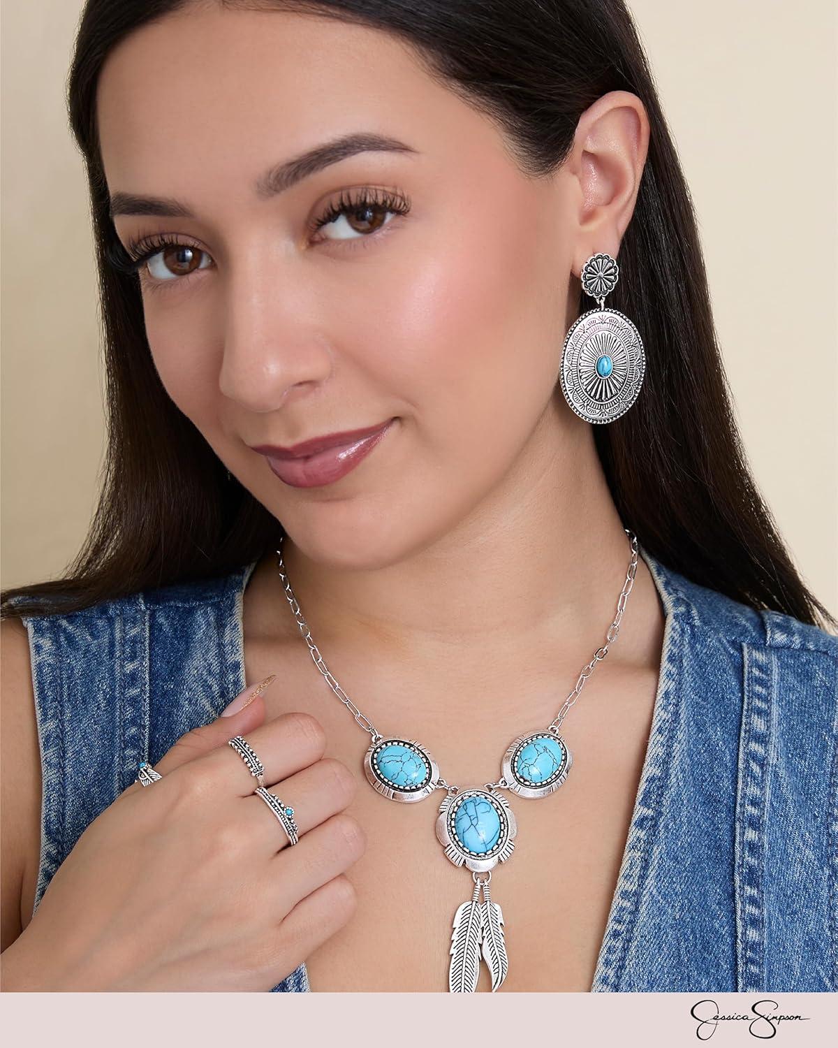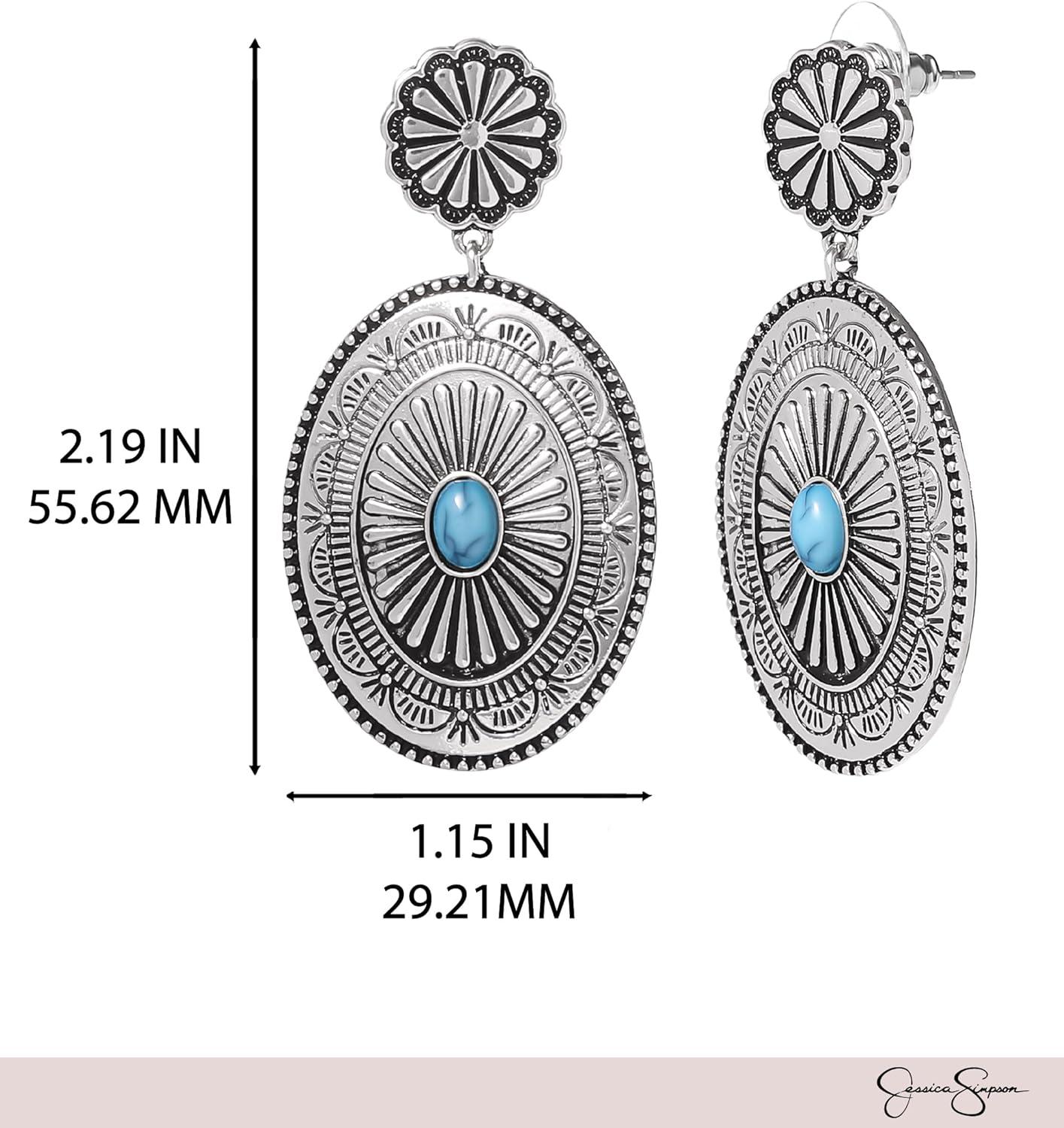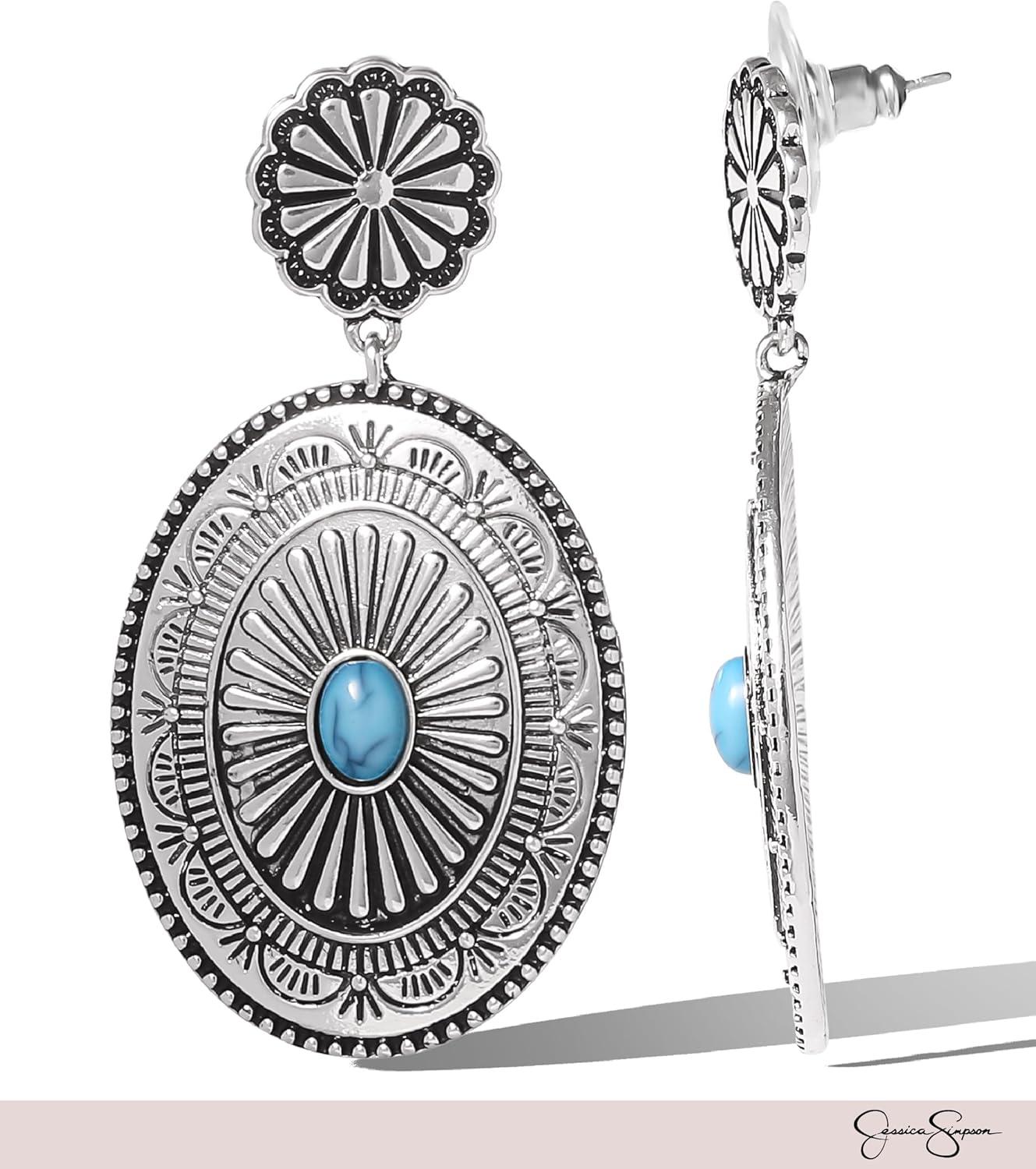 The Jessica Simpson Jewelry Collection captures Texas glam style with these striking Western turquoise earrings for women. Featuring a large flower-shaped stud and a dangling concho pendant with a turquoise center, they offer a bold, eye-catching look.