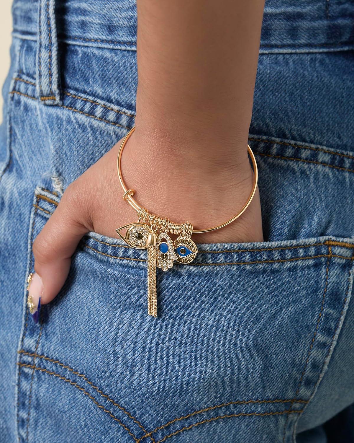 Embrace positivity and enhance your style with our evil eye bracelets. Crafted from gold-tone brass, these bracelets feature delightful embellishments like turquoise beads, eclectic charms, and alluring evil eye square pendants.