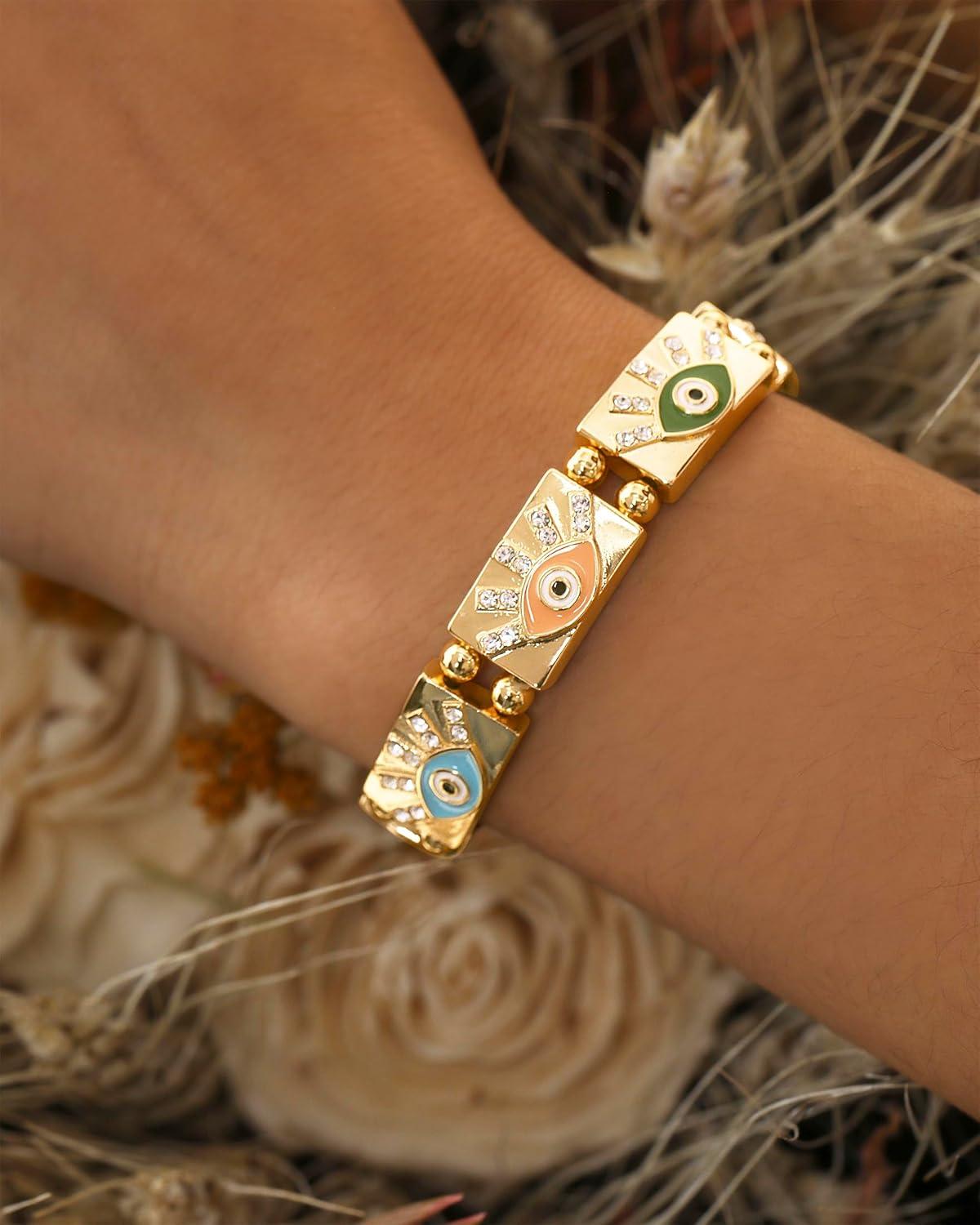 Embrace positivity and enhance your style with our evil eye bracelets. Crafted from gold-tone brass, these bracelets feature delightful embellishments like turquoise beads, eclectic charms, and alluring evil eye square pendants.