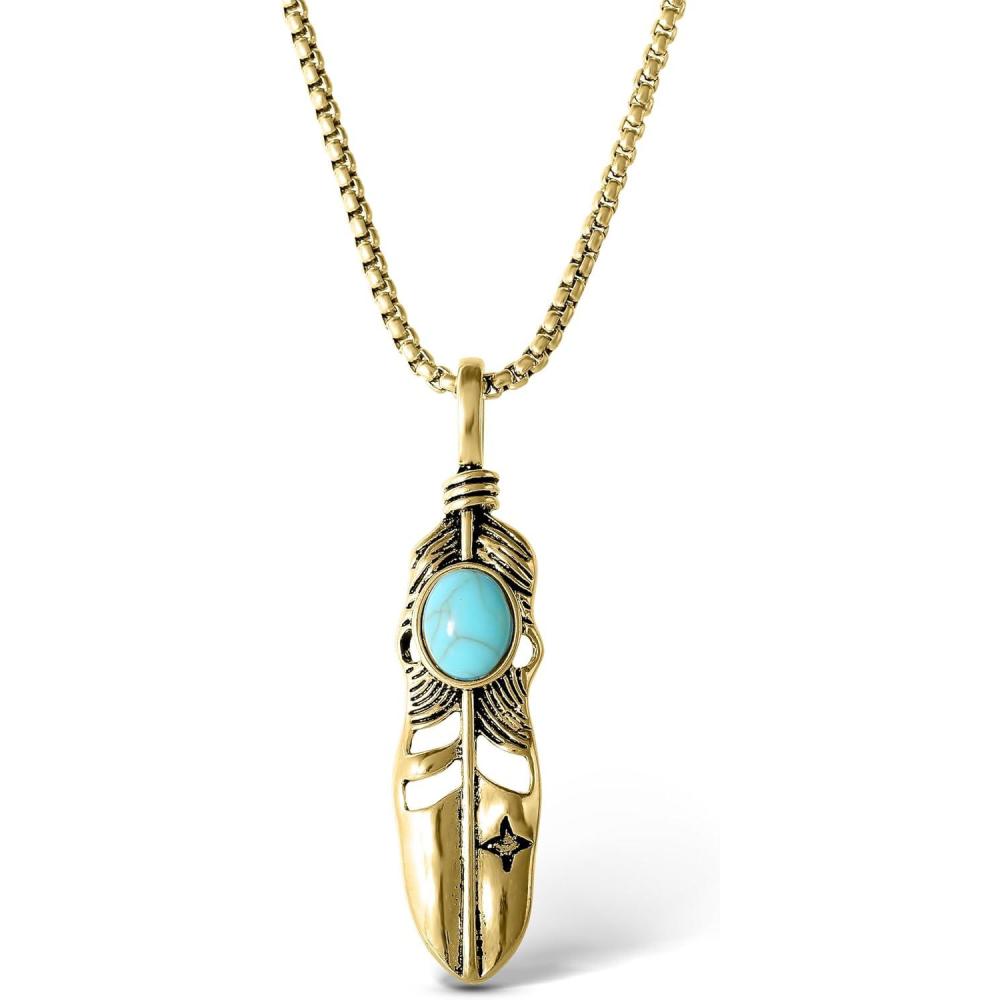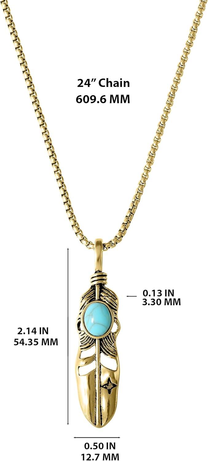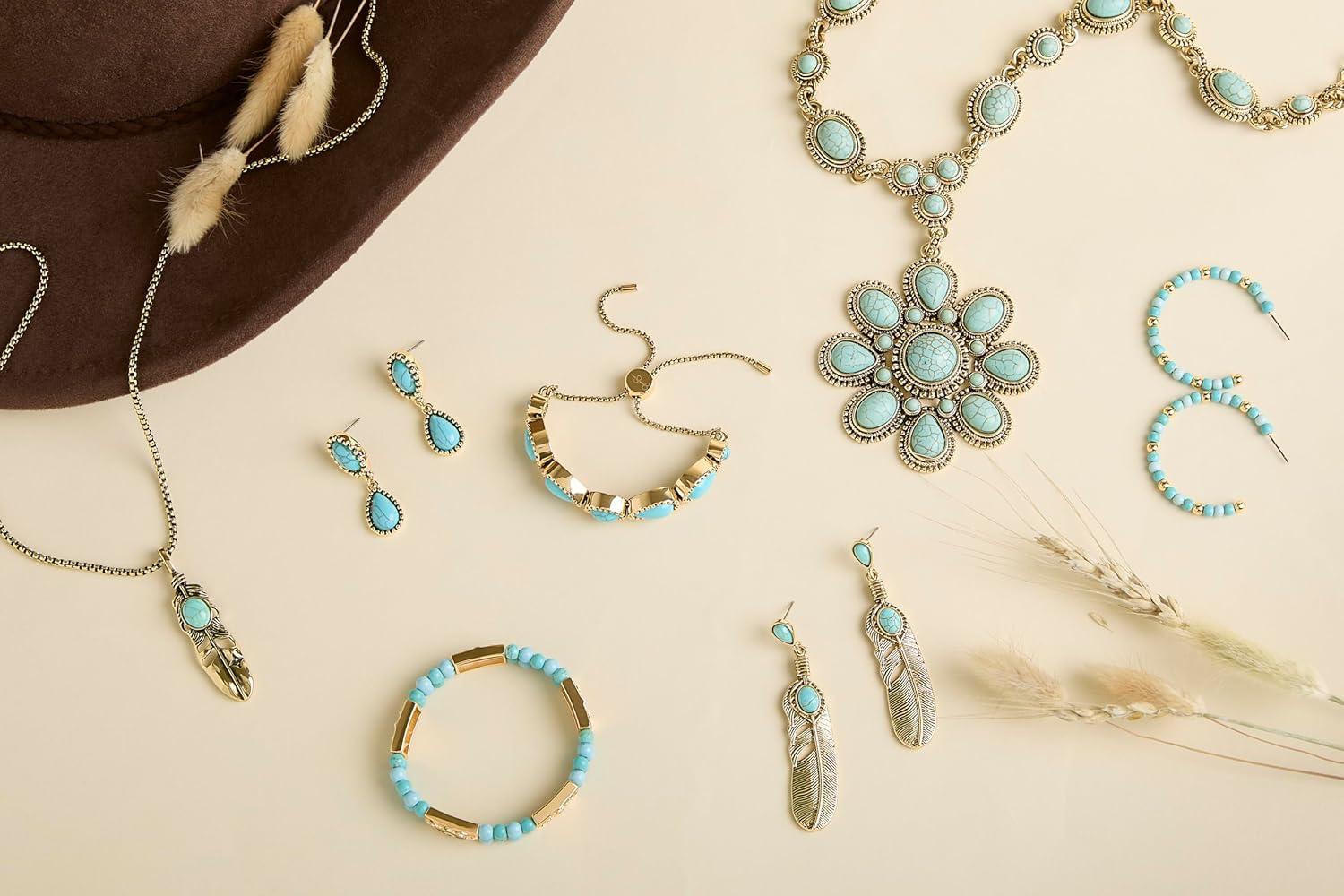 The Jessica Simpson turquoise jewelry collection offers a striking blend of Texas Glam and vintage charm in its turquoise necklaces. These necklaces feature a captivating feather pendant adorned with a turquoise stone, set against oxidized gold-tone or silver-tone metal. With a generous 23-inch chain, this necklace ensures easy and eye-catching wear, making the turquoise pendant the focal point of any outfit.