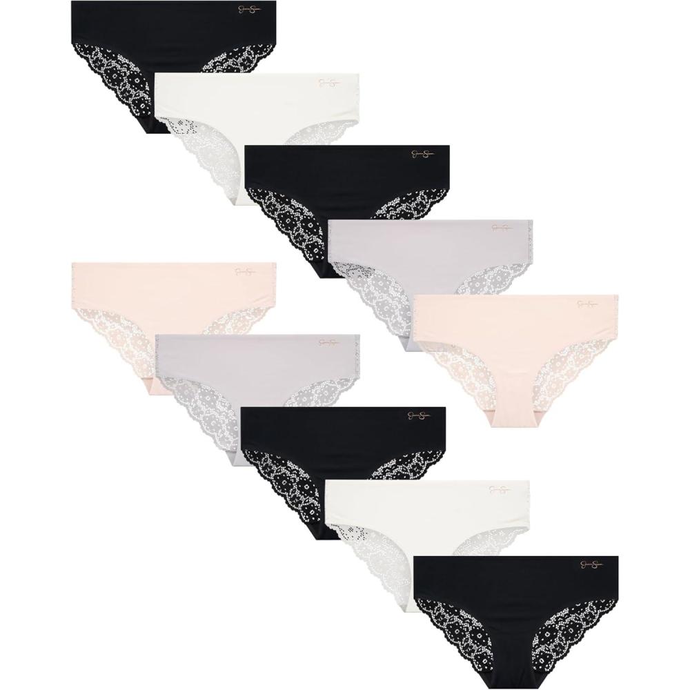 Jessica Simpson Women’s Hipster Underwear – 10 Pack Sexy Lace Trim No Show Seamless Briefs – Panties for Women (S-XL)(White Multi)