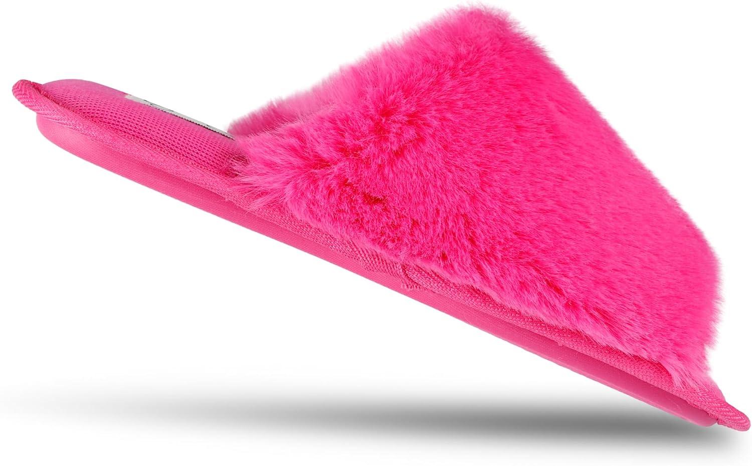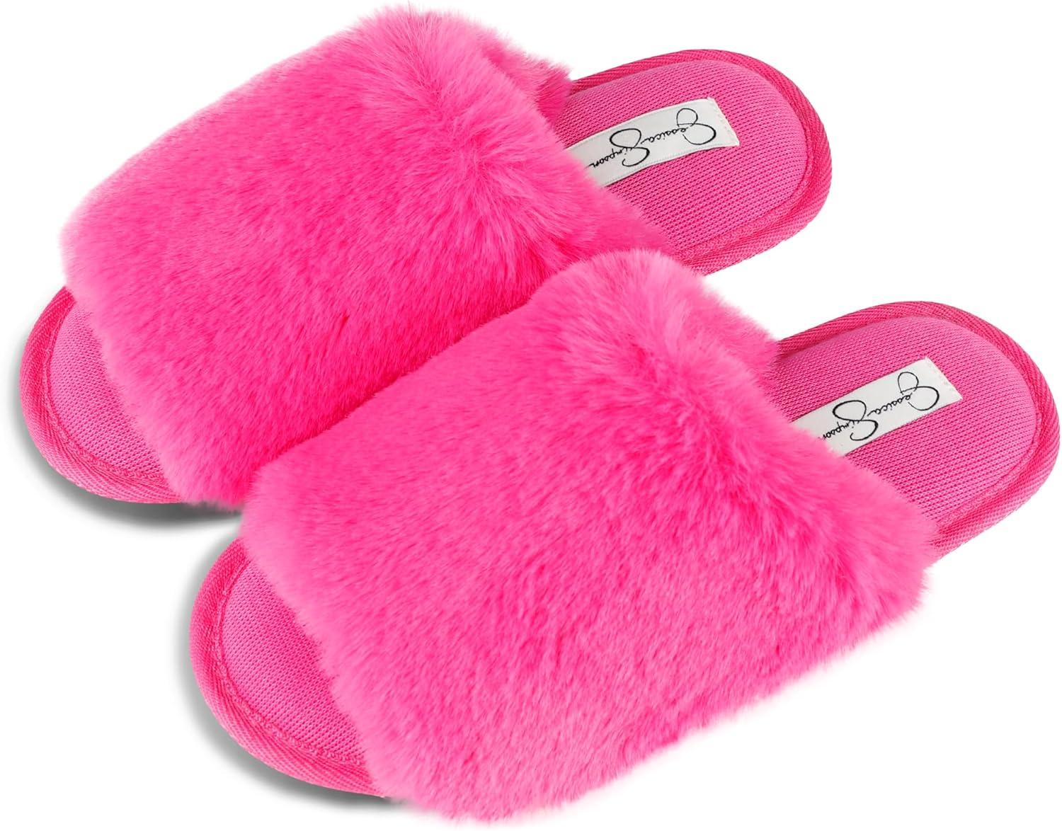 Jessica Simpson Women’s Plush Faux Fur Fuzzy Slide on Open Toe Slipper with Memory Foam(Neon Pink)