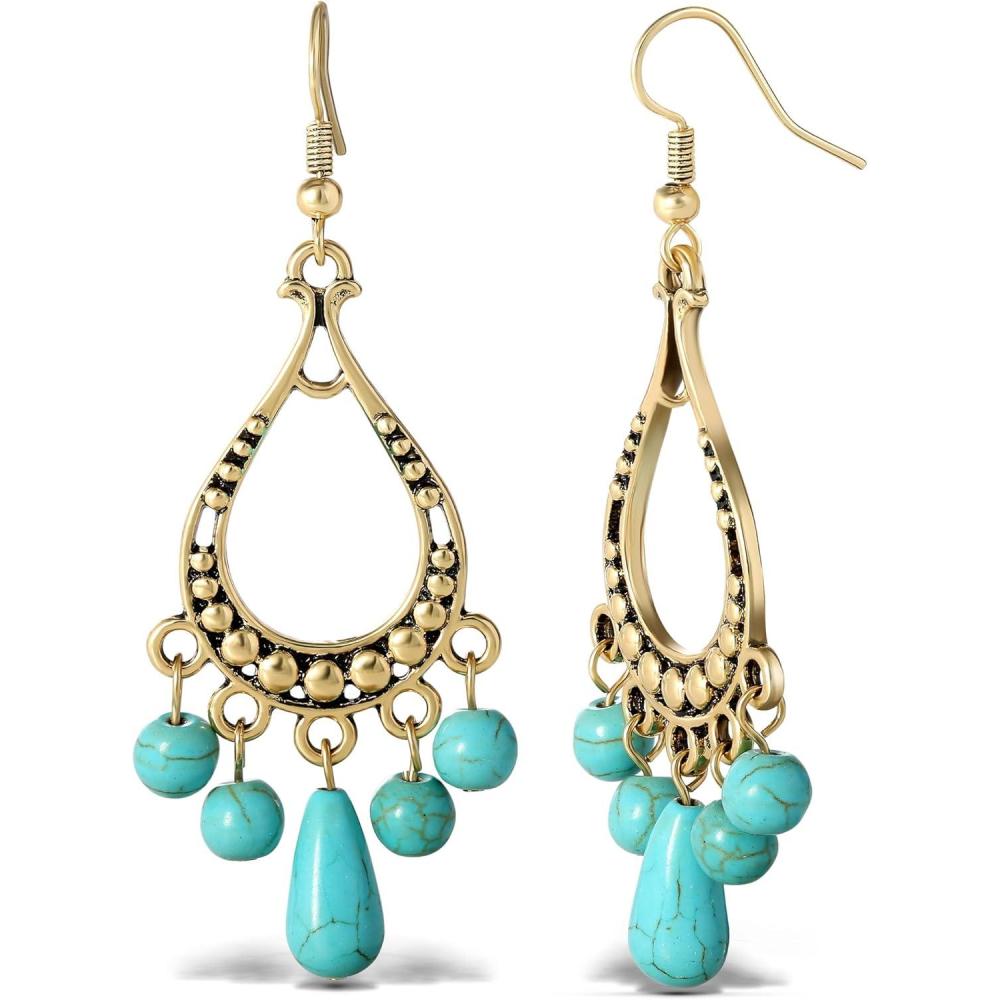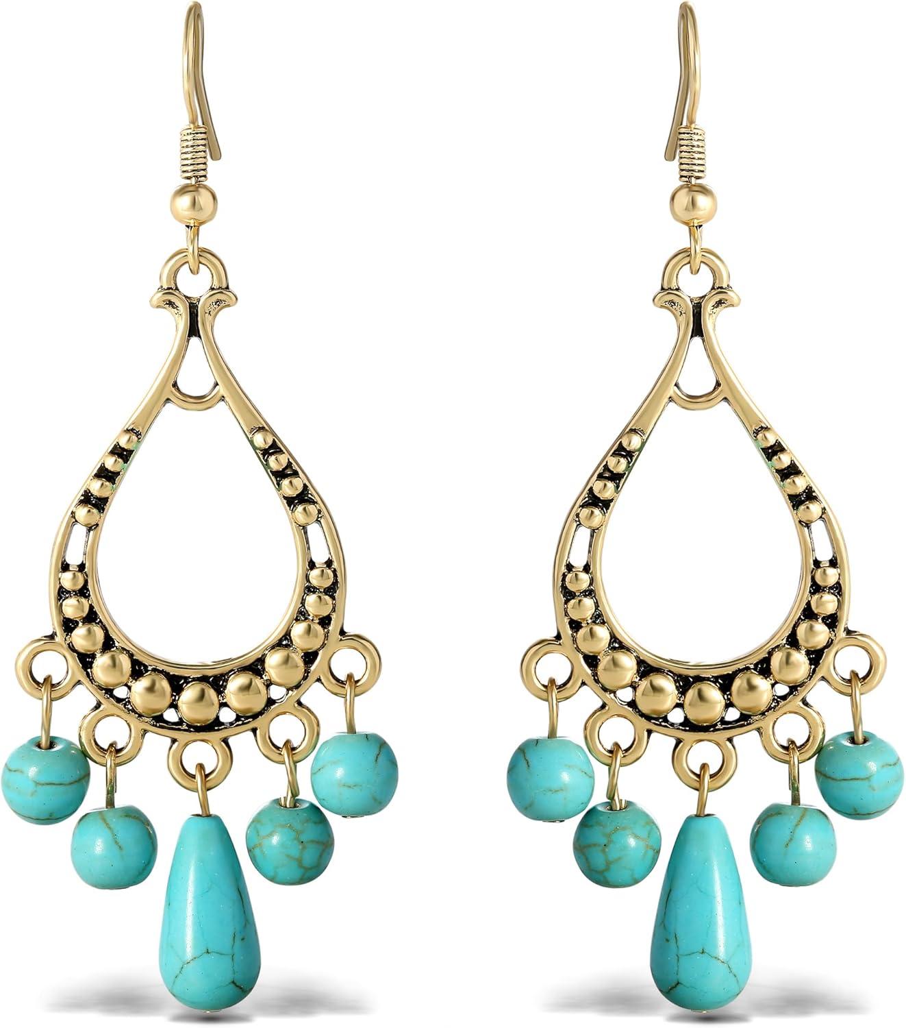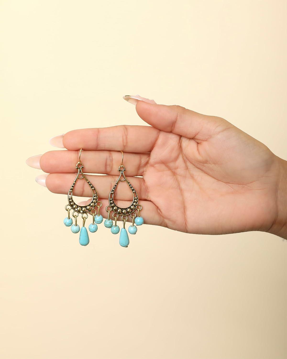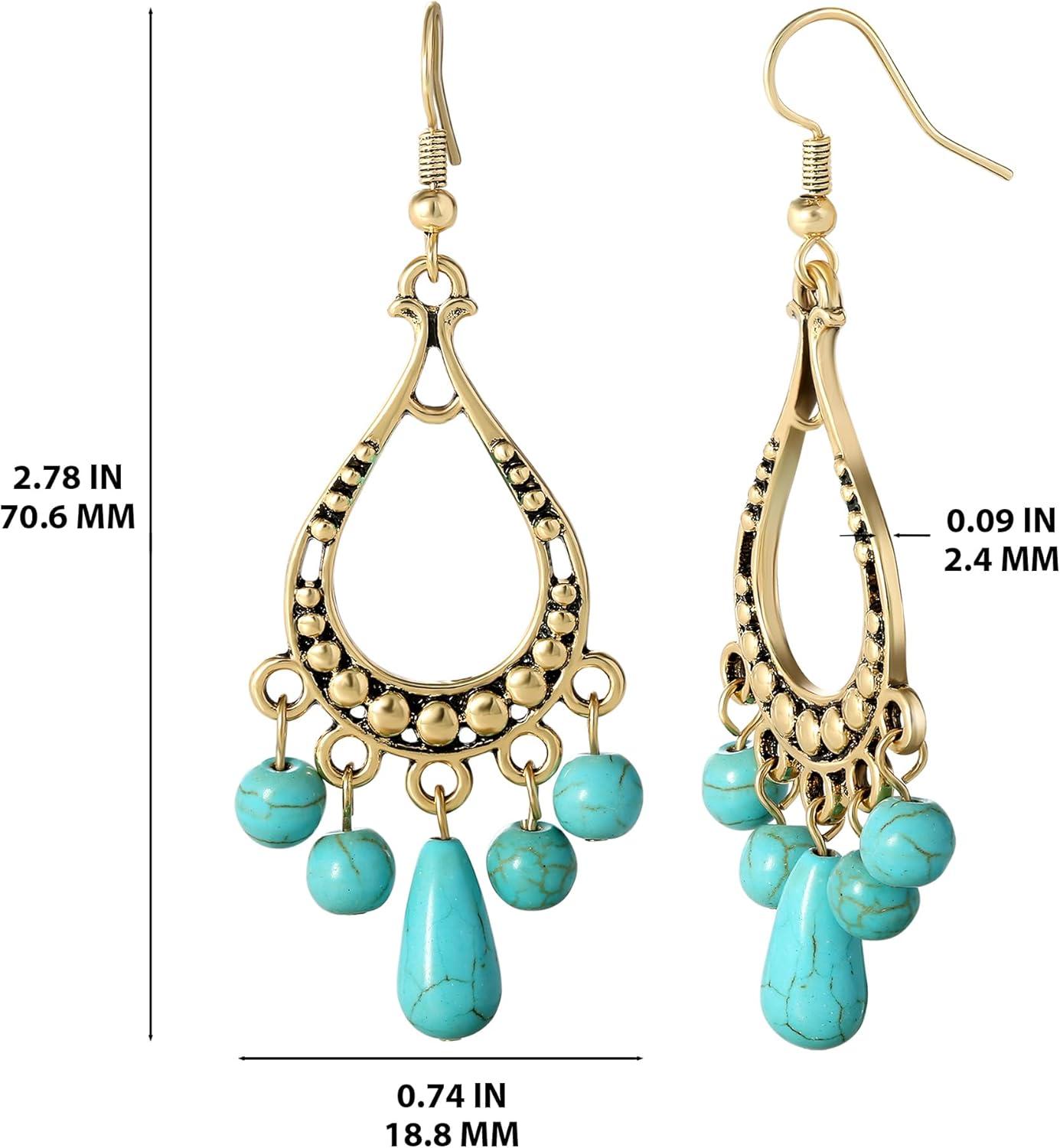 These turquoise earrings for women are available in either oxidized gold-tone or silver-tone metal, adding a touch of vintage charm to any ensemble.