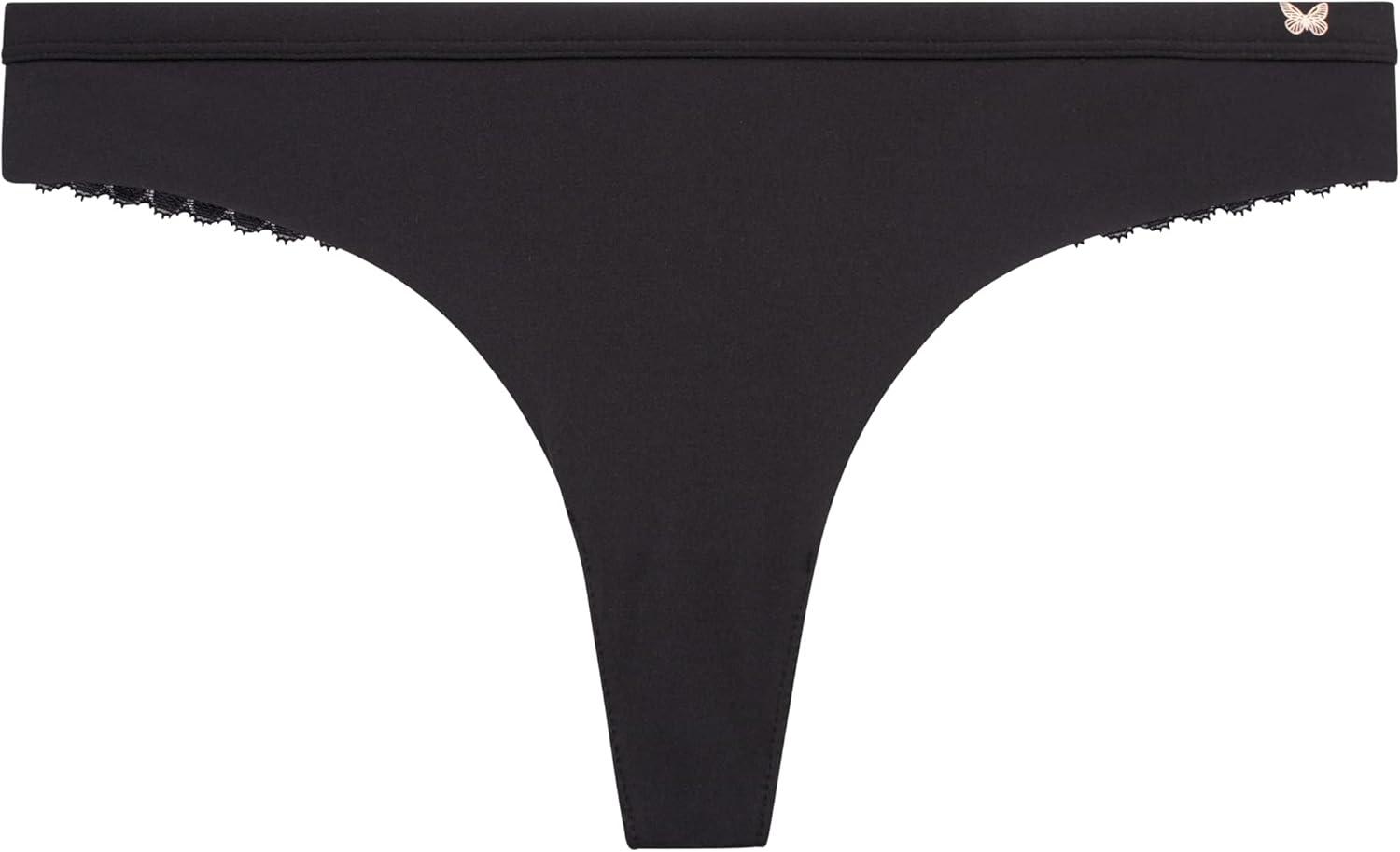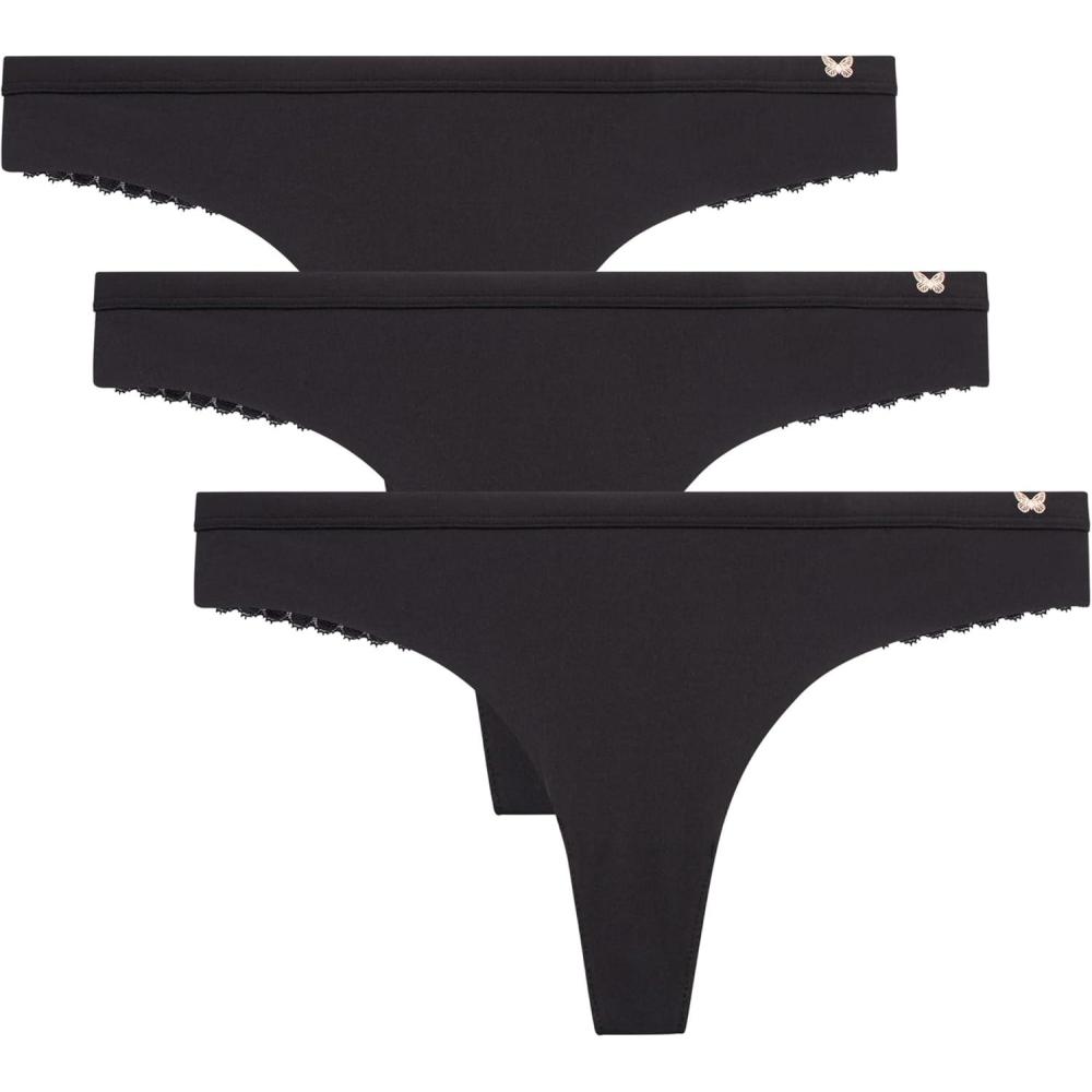 Jessica Simpson Women’s Underwear Breathable Thongs, No Show Ladies Panties, Soft Microfiber Stretch Lace, Tanga, 3 Pack(Black/Black/Black)
