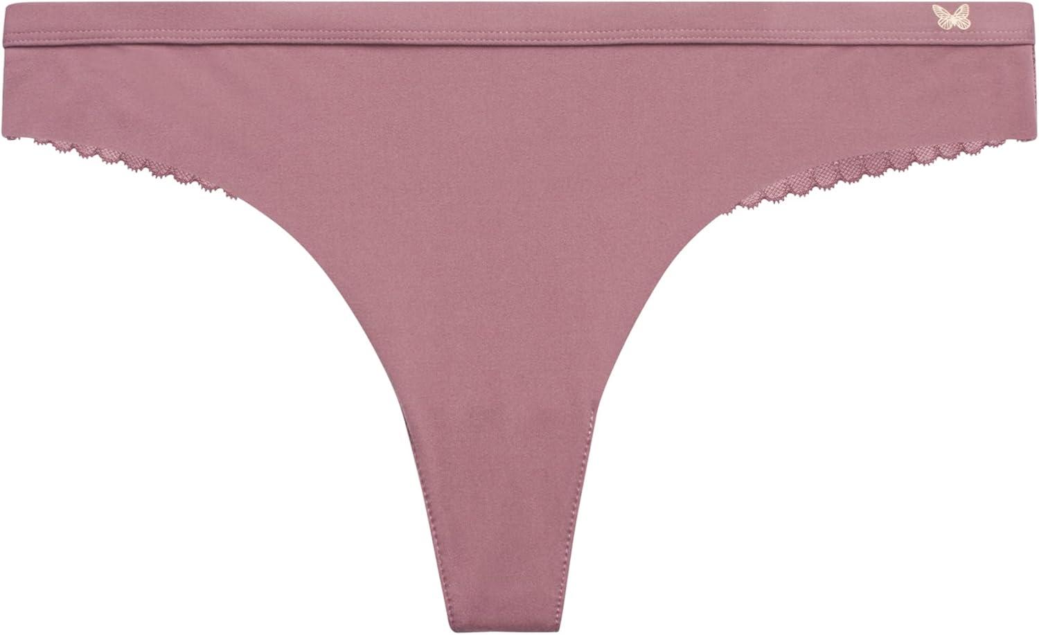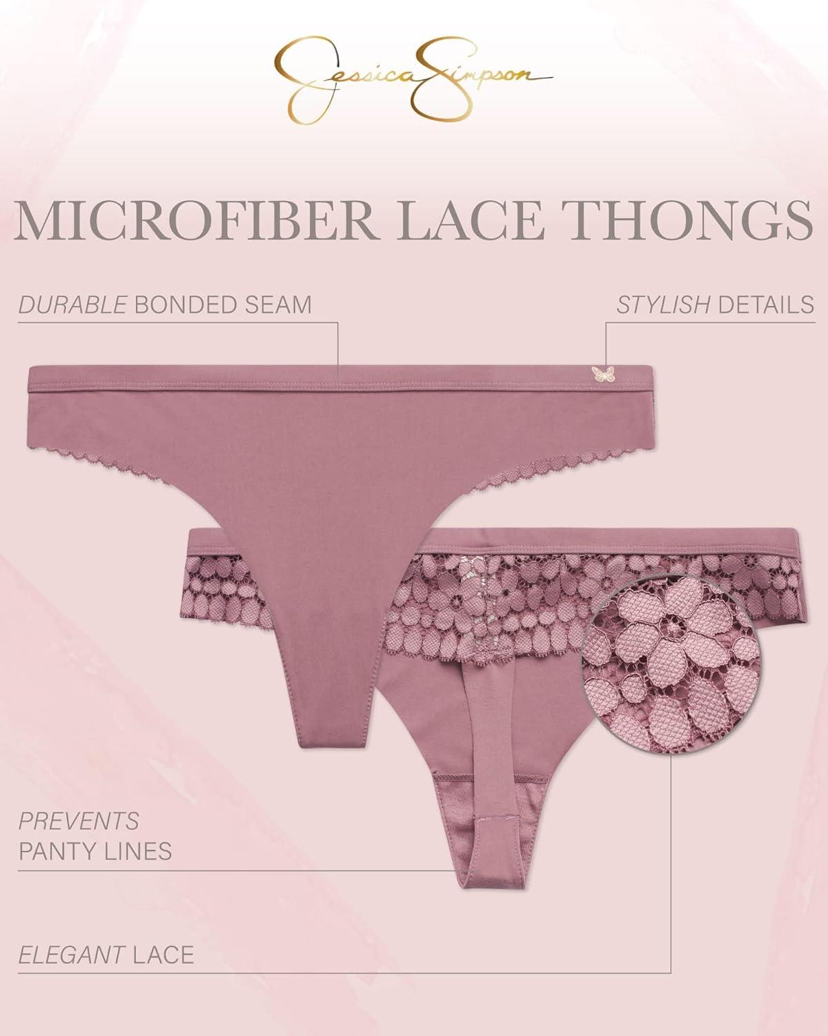 Jessica Simpson Women’s Underwear Breathable Thongs, No Show Ladies Panties, Soft Microfiber Stretch Lace, Tanga, 3 Pack(Black/Grape Shake/Rose Smoke)